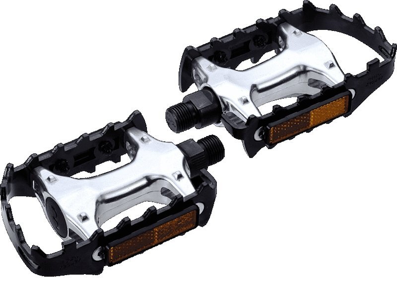 A super strong, heavy duty aluminium pedal. The aluminium body is super strong but lightweight. The cage makes sure your feet have a big surface to rest on. The surface is covered with a special pattern that keeps your feet on the pedal, you got as much grip as possible. And last but not least; reflectors on both sides of the pedal to make sure other people will see you on your bike in the dark.