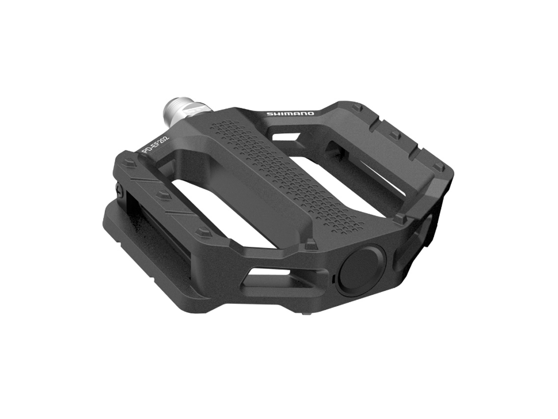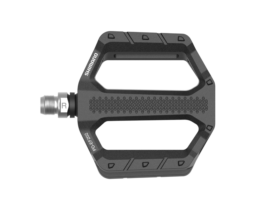 For casual riding, Shimano’s PD-EF202 flat pedals feature a wide aluminum body and textured surface for a stable pedaling platform.
